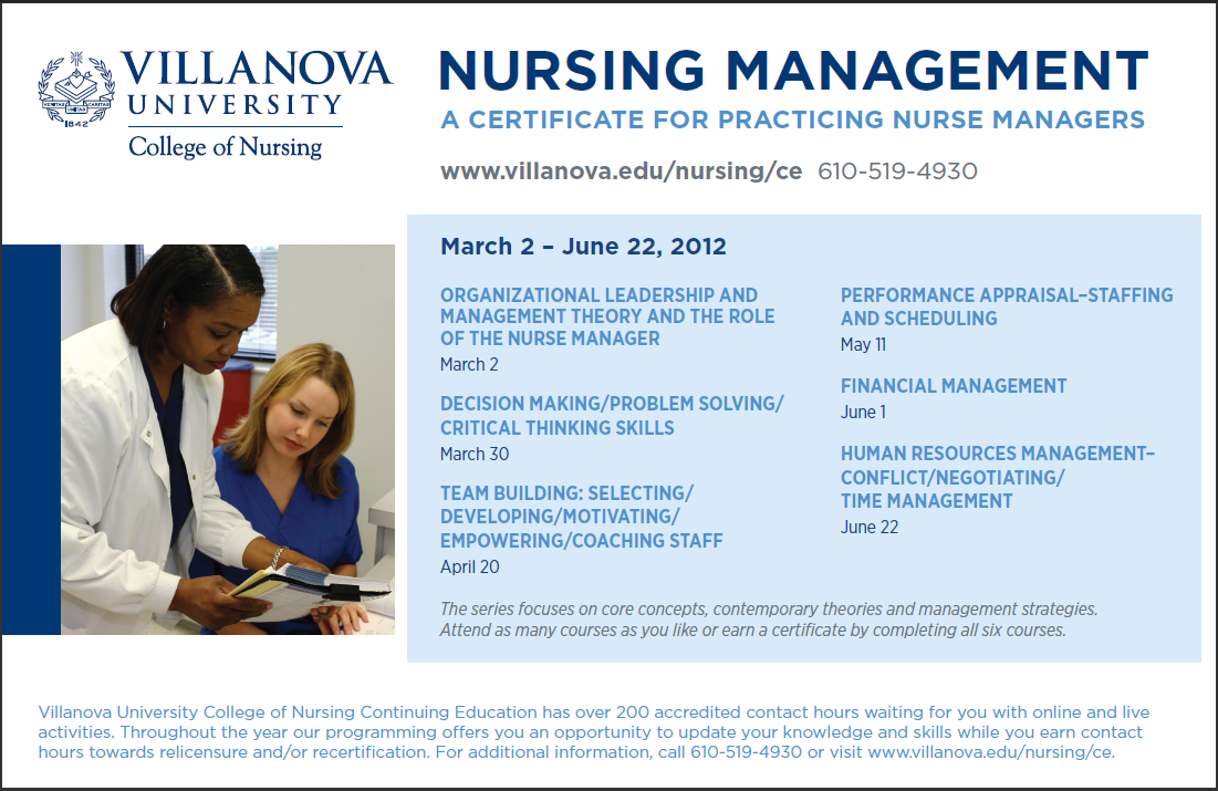 The 34.5 contact hour program will be held from March 2 – June 22, 2012. It focuses on core concepts, contemporary theories and management strategies. Topics included: organizational leadership and management theory, the role of the nurse manager, decision making/problem solving/critical thinking skills, team building, motivating/empowering/coaching staff, performance appraisal, staffing and scheduling, financial management and human resources management.
